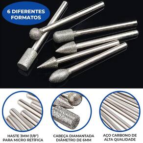 Kit 20 pontas diamantadas micro retíficas haste 3mm cabeça 6mm dremax Jogo com 20 pontas diamantadas, indicado para trabalhos de polimento, desbaste e gravação com micro retificas. Para artesanato, escultura, retoque, polimento e acabamento de vidro, cerâmica, mármore, pedras, aço e outros materiais duros. Diferenciais: - revestidos com diamante: cada ferramenta do conjunto é revestida com diamantes genuínos, garantindo nitidez e longevidade superiores. - compatibilidade universal: possui haste de 1/8 3mm , tornando-o universalmente compatível com todas as micro retíficas do mercado Organizado e portátil: vem em uma caixa de transporte conveniente, garantindo fácil organização e portabilidade. Para várias tarefas: ideal para fabricação detalhada de joias, projetos de arte complexos e outras operações que demandem precisão. Itens inclusos - 4 pontas diamantadas esféricas - 4 pontas diamantadas cilíndricas - 3 pontas diamantadas ovais - 3 pontas diamantadas cônicas - 3 pontas diamantadas cilíndricas com ponta arredondada - 3 pontas diamantadas cônicas tipo bala Especificações - marca: dremax - modelo: kbd-20 - diâmetros das hastes: 3mm - diâmetros das pontas de trabalho: 6mm - comprimento: 45mm - indicado para todas as marcas de micro retíficas, como dremel, charbs, einhell, black+decker, dremax, mondial, vonder, titanium, western, ingco, gamma, wesco, etc. - peso: 100 gramas - : 90 dias contra defeitos de fabricação