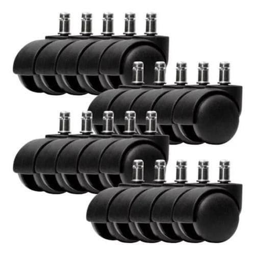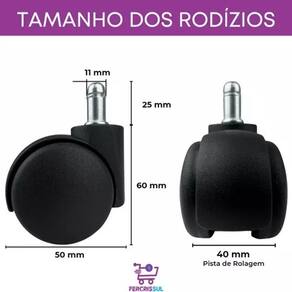 Kit 20 Rodízios Para Cadeira De Escritório Rodízios para Cadeira de Escritório Kit com 20 Unidades? Alta Qualidade e Durabilidade ?? Material Resistente: Fabricados em plástico e metal de alta resistência, garantindo longa vida útil.? Movimentação Suave: Rodas duplas que deslizam facilmente, evitando arranhões no chão.? Fácil Instalação: Sistema de encaixe universal para cadeiras de escritório.? Versatilidade: Ideal para cadeiras de escritório, gamer e outros móveis com rodízios.* Rodízio em Nylon 2 Polegadas 50mm para Cadeiras e Movéis em Geral* ATENÇÃO: Este pino de encaixe é padrão em aproximadamente 95% dos modelos de cadeira, todavia recomendamos remover um de seus rodízios e verificar se é este mesmo padrão de sua cadeira, de pino com diâmetro de 11mm e um anel no topo, conforme fotos do produto.CARACTERÍSTICAS DO PRODUTO- Pino removível- Diâmetro da roda: 50mm- Pino removível com 11mm de espessura e 25mm de altura- Pino com anel elástico para fixação- Composição: Corpo e Roda em Nylon, eixo e pino em Aço SAE1020.- Roda Revestida com Poliuretano, NÃO RISCA O CHÃO- Certificação ABNT NBR 13962/06- Carga por rodízio: 30kg Conteúdo da embalagem: 20 rodízios para cadeira? Tamanho do pino: Padrão universal (verifique a compatibilidade com sua cadeira)? Compre agora e renove sua cadeira com rodízios novos! Marca: EDR Import