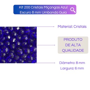 O Kit de 200 Miçangas Azul Escuro de Cristais da Bialluz, é ideal para criar guias de umbanda e candomblé que emanam paixão e energia,cada uma com 8 milímetros de beleza única.Essas miçangas de alta qualidade são a escolha perfeita para elevar suas práticas espirituais.