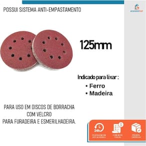 O disco de lixa é ideal para se usar com discos de borracha, furadeira e esmerilhadeira. Produzido em lixa abrasiva com pluma indicado para lixar ferro e madeira.CARACTERÍSTICAS TÉCNICAS:Material: Resina, óxido de alumínio, papel e plumaMedidas: 125mm (5”)Quantidade de furos: 8 Limite máxima: 12.220rpmGrão: 120Quantidade: 200 unidadesMarca: StarferRef.: 4003349(200)