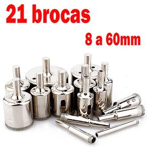 O Kit de 21 Brocas Diamantadas. Essas brocas foram projetadas para oferecer desempenho e precisão ao perfurar uma ampla variedade de materiais, incluindo vidros (exceto vidros temperados), mármores, granitos, espelhos, garrafas, pisos, azulejos, cerâmicas e madeiras.