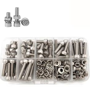Benefícios: Resistência à corrosão: ideal para ambientes internos e externos Praticidade: componentes organizados por tamanho, economizando tempo na hora de usar Versatilidade: atende projetos mecânicos, elétricos, de manutenção e montagem Acabamento profissional: peças precisas para fixações firmes e seguras Especificações técnicas: Material: aço inoxidável de alta resistência Quantidade total: 216 peças, incluindo: Parafusos soquete hexagonal diferentes tamanhos porcas correspondentesarruelas planasembalagem: caixa organizadora resistente com divisórias