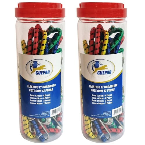 Kit 24 Elásticos para Bagageiro Carga Moto Bike Gancho Metal O elástico para bagageiro é ideal para prender objetos em motos, carros, bicicletas, carrinhos de mão entre outros. Possui corpo em borracha, polipropileno e aço e possui gancho nas pontas. - Marca: Guepar - Referência: 861-1369-2X - Indicado para diversas formas de uso como amarrar carga, bagagens, entre outros - 8 Elásticos 30cm x 6mm - 8 Elásticos 45cm x 6mm - 4 Elásticos 60cm x 6mm - 4 Elásticos 90cm x 6mm - Indispensável para amarração e segurança no transporte de cargas com bicicletas, carrinhos de mão, moto, pick ups, caminhonetes, bagageiro de carros, como camping, pesca, motociclismo, paraquedismo, asa-delta, etc... - Fabricada em borracha trançada de alta resistência revestido com fibra - Ganchos de aço carbono com acabamento em zinco - Pontas dos ganchos revestidos com borracha para não danificar os veículos - O Cabo de Elástico Extensor é fácil de usar e ajustar, pois tem ganchos em cada ponta que ajudam a prender os objetos de forma segura e prática. - : 90 dias Marca: Não Informado Ean: 7734625901154