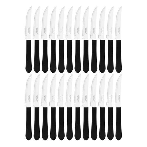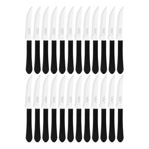conteúdo do kit: 24 - facas de mesa churrasco tramontina leme inox cabo preto. Características do produto: lâmina: em aço inox; cabo: polipropileno preto. Dimensões produto compr. X larg. X alt. : comprimento: 20,2 cm largura: 0,9 cm altura: 1,8 cm