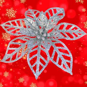 Kit 24 Flores Gliter Prata Decoração Árvore De Natal De 14cm -