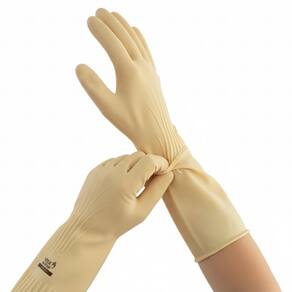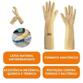 Luva de segurança confeccionada em látex natural, relevo antiderrapante na palma e ponta dos dedos, detalhes de ranhura no punho.