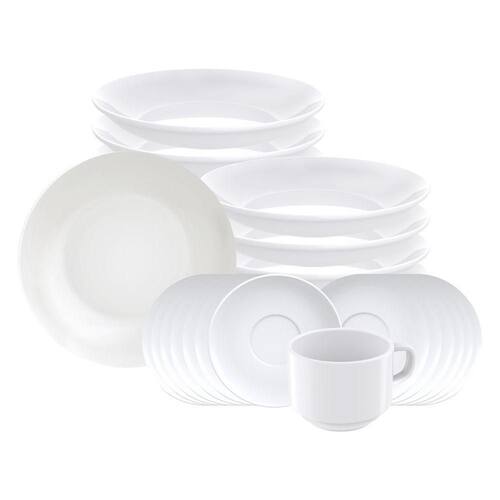 O kit é composto por 12 pratos de sobremesa Leonora em porcelana branca, com 19 cm de diâmetro cada, e 12 conjuntos de xícara de chá Paola em porcelana branca, com capacidade de 240ml cada.