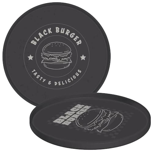 O conjunto de pratos para hambúrguer da linha Black Burger da Tramontina são fabricados em polipropileno com proteção antimicrobiana, são peças livres de BPA, duráveis, leves e resistentes, próprios para uso comercial em restaurantes e hamburguerias. Possuem um design diferenciado que destaca a apresentação dos hambúrgueres e outros itens do cardápio.