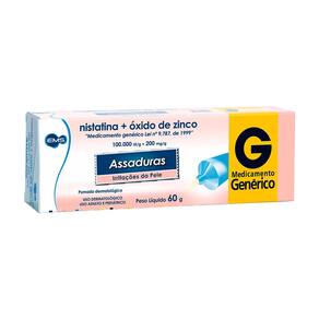 Kit 24 und Nistatina + Óxido De Zinco Pomada 60g - Ems A indicação principal da nistatina + óxido de zinco é para assaduras de bebês, principalmente relacionadas ao uso de fraldas. Além dessa indicação, a nistatina + óxido de zinco pode ser usada em crianças maiores e adultos, no tratamento de irritações na região dos órgãos genitais e das nádegas, entre os dedos, nas axilas, sob os seios ou em outras áreas da pele que sofrem atrito.