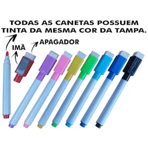 Contém: 240 Canetas para quadro branco 11x1cm com apagador e imã na tampa nas cores: vermelho, lilas, rosa, amarelo, verde, azul claro, azul escuro e preto 30 canetas de cada cor . Marca: Não Informado