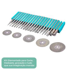 Kit discos de corte e pontas diamantadas 25 peças para micro retíficas 3mm dremax Indicado para trabalhos de corte de gravação com micro retificas. Para artesanato, escultura, retoque, polimento e acabamento de vidro, cerâmica, mármore, pedras, aço e outros materiais duros. Diferenciais: - revestidos com diamante: cada ferramenta do conjunto é revestida com diamantes genuínos, garantindo nitidez e longevidade superiores. - compatibilidade universal: possui haste de 1/8 3mm , tornando-o universalmente compatível com todas as micro retíficas do mercado Conjunto abrangente: inclui 5 discos diamantados e pontas diamantadas atendendo a uma ampla gama de tarefas de polimento, corte e gravação Organizado e portátil: vem em uma caixa de transporte conveniente, garantindo fácil organização e portabilidade. Para várias tarefas: ideal para fabricação detalhada de joias, projetos de arte complexos e outras operações que demandem precisão. Itens inclusos - diâmetros das hastes: 3mm - diâmetro dos furos dos discos: 3mm - 2 discos de 16mm 5/8 pol. - 1 discos diamantado de 20mm 3/4 pol. - 1 disco diamantado de 22mm 15/16 pol. - 1 disco diamantado de 25mm 1 pol. - 1 ponta diamantada paralela 1mm - 1 ponta diamantada paralela 1.2mm - 1 ponta diamantada paralela 1.8mm - 1 ponta diamantada paralela 2mm - 1 ponta diamantada cabeça chata fina 1mm - 1 ponta diamantada cabeça chata fina 1.3mm - 1 ponta diamantada cabeça chata fina 2.0mm - 1 ponta diamantada cabeça chata fina 2.2mm - 1 ponta diamantada cabeça chata fina 2.4mm - 1 ponta diamantada cilíndrica 2.6mm - 1 ponta diamantada cilíndrica 3.0mm - 1 ponta diamantada cilíndrica 3.4mm - 1 ponta diamantada cilíndrica 2.6mm - 1 ponta diamantada esférica 2.0mm - 1 ponta diamantada esférica 2.4mm - 1 ponta diamantada esférica 4.0mm - 1 ponta diamantada cabeça plana 3.5mm - 1 ponta diamantada cabeça cônica 2.4mm - 2 hastes para disco Especificações - marca: dremax - modelo: kad-25 - indicado para todas as marcas de micro retíficas, como dremel, charbs, einhell, black+decker, dremax, mondial, vonder, titanium, western, ingco, gamma, wesco, etc. - peso: 104 gramas - : 90 dias contra defeitos de fabricação