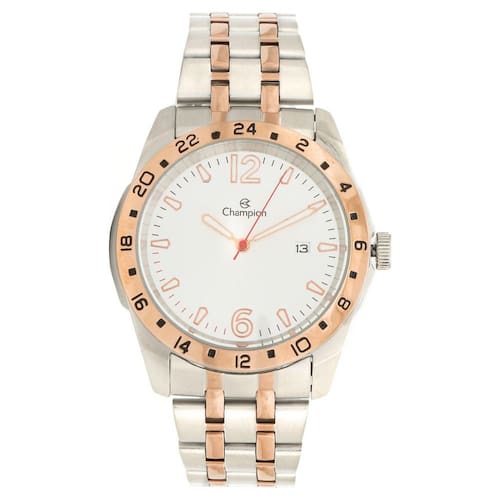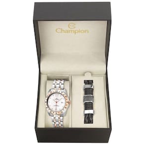 DETALHES DO PRODUTO Kit 2pçs Relógio Champion CA30196D Prata/Rosê Tipo de Produto: Kit 2pçs Relógio Modelo: Analógico Material Externo: Metal Material Interno: Metal Tecnologia: Calendário Caixa: Prensado Fecho: Fivela de implantação Medidas da peça: Medidas da caixa: 4cm de altura e 4cm de largura; Medidas da pulseira: 18,5cm de comprimento e 2cm de largura; Características Especiais: Acompanha pulseira Material da caixa: Aço inoxidável; Mostrador: Com algarismos e ponteiros de horas, minutos e segundos; Resistência à água: 50m; : 1 ano. INFORMAÇÕES SKUCH065ACM41VPI Modelo champion CA30196D Características Especiais Acompanha pulseira Material da caixa: Aço inoxidável; Mostrador: Com algarismos e ponteiros de horas, minutos e segundos; Resistência à água: 50m; : 1 ano. Corprata Ean: 7891511374215