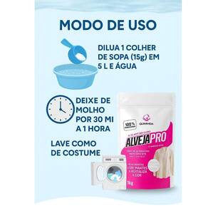 Kit com 2 AlvejaPro Quimivida 1kg Cada Brilho e Renovação das Roupas O que você vai receber: 2 unidades de AlvejaPro Quimivida 1kg Descrição do Produto: O AlvejaPro Quimivida é um reforçador de lavagem com ação do oxigênio ativo, desenvolvido para ajudar na remoção de manchas do dia a dia como café, vinho, suor e encardidos. Sua fórmula à base de percarbonato de sódio cuida dos tecidos, mantendo as roupas mais claras, coloridas e com aparência renovada, sem uso de cloro. Benefícios: Fórmula com oxigênio ativo que ajuda na remoção de manchas. Realça o branco e mantém cores mais vivas. Indicado para roupas de cama, mesa, banho e uso diário. Pode ser em máquinas de lavar ou em tanques. Produto versátil: auxilia também em lavagens de tecidos delicados. Não agride as fibras dos tecidos. Embalagem econômica de 1kg cada. Modo de Uso: Pré-lavagem: dissolva cerca de 15g em 1 litro de água morna e deixe a peça de molho por até 30 minutos. Lavagem em máquina: adicione 1 a 2 colheres de sopa junto com o sabão de sua preferência. Para melhores resultados, utilize água morna. Manchas localizadas: prepare uma pastinha com o produto e água, aplique sobre a mancha e aguarde alguns minutos antes de lavar. Observações Importantes: Recomendado sempre testar em uma pequena área da peça antes do uso. Armazenar em local seco, fresco e ao abrigo da luz. Marca: Não Informado Ean: 7891711855859