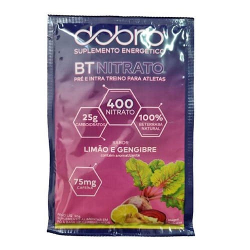 O bt nitrato limão e gengibre sachê dobro é um suplemento com 25g de carboidratos e 400mg de nitrato proveniente da beterraba. Produtos de nutrição esportiva ricos em nitrato podem ter um impacto direto na eficiência energética e, como resultado, melhorar o desempenho do atleta, através do aumento de óxido nítrico e consequente melhora da circulação e redução do custo de oxigênio durante o exercício.