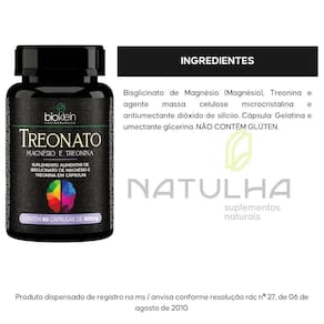 ingredientes bisglicinato de magnésio magnésio , treonina e agente massa celulose microcristalina e antiumectante dióxido de silíciio. Cápsula: gelatina e umectante glicerina. Não contém glúten. Anvisa: produto indicado para maiores de 19 anos este produto não é um. Não exceder a recomendação diária de consumo indicada na embalagem. Mantenha fora do alcance de crianças. Este produto não deve ser consumido por gestantes, lactantes e crianças. Produto dispensado de registro conforme rdc 240/2018.