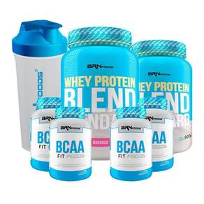 Kit 2x Whey Protein Blend 900g Morango + 4x BCAA 100g + Coqueteleira 600mL - BRNFOODSO Whey Blend 900gr é um suplemento proteico composto de 7 tipos de proteínas ideal para aumentar a fonte desse nutriente em sua dieta. O Kit 2x Whey Protein Blend 900g + 4x BCAA 100g + Coqueteleira 600mL - BRNFOODS é ideal para seu treino.Whey Protein Blend Standard 900g brn Foods -Suplemento proteíco desenvolvido com proteínas concentradas de alto valor biológio para otimizar ganhos de massa muscular e energia na recuperação de treinos intensos. As proteínas contidas em whey protein blend se completam aumentando a cadeia de aminoácidos existentes e que são necessárias ao corpo humano.Nos sabores de Chocolate, Baunilha e Morango.BCAA FIT FOODS 100g Tangerina - A suplementação com BCAA está entre as mais importantes para qualquer programa nutricional esportivo, pois eles são indispensáveis para a manutenção e crescimento dos músculos.É indicado para ser ingerido logo após o treino, pois fornece energia e retarda a fadiga central. Estimula a síntese de proteína muscular recuperando imediatamente os músculos danificados e prevenindo dores.A Coqueteleira ClássicaFeita com materiais de qualidade, ela conta com uma tela para facilitar a mistura dos suplementos e tem um design ideal para encaixar no console do carro, esteira ou bicicleta, oferecendo máxima praticidade para você.- Linha Classic Slim- Fechamento em click- Livre de BPA- Livre de Ftalato- Capacidade: 600mlIsento de registro - RCD 27/2010 ANVISA .