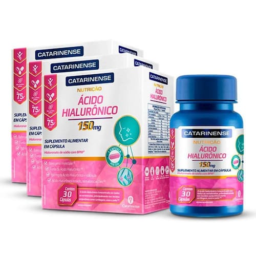 Kit 3 Ácido Hialurônico Catarinense 30 Cápsulas O Ácido Hialurônico AH é um tipo de polissacarídeo composto de repetidos dissacarídeos de Ácido D-glucurônico e N-acetil-D-glucosamina.1 O Hialuronato de sódio é a forma de sal de sódio e também a forma comercial do Ácido Hialurônico. O ácido hialurônico é uma substância encontrada em todos os vertebrados, principalmente nos tecidos conjuntivos como cartilagem, osso, pele, etc. O ácido hialurônico é componente de importantes líquidos do corpo, como, por exemplo, o líquido sinovial presente nas articulações sinoviais e o humor vítreo presente nos olhos , vale ressaltar que a maior parte do AH no organismo está situada na pele. A pele é o maior órgão do corpo e atua como uma barreira protegendo contra fatores exógenos e evitando a perda de água do corpo. Em particular, mais de 50% do ácido hialurônico corporal total está presente na pele.4,5 O conteúdo de AH da derme é muito maior do que o da epiderme. Guardar o produto à temperatura ambiente entre 15C e 30ºC , ao abrigo da luz, bem fechado e protegido da umidade. Frasco selado com lacre de proteção embaixo da tampa. Se o lacre estiver violado, recuse o produto. Ingestão Recomendada Ingerir 1 cápsula ao dia. Contém 150 mg de Acido Hialurônico por cápsula. Quantidade 30 cápsulas. Marca: Não Informado Ean: 7898713096624