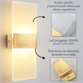 Kit 3 Arandela Cabeceira Acrilico Jateado Led Integrado Lup95 Essa peça tem o poder de deixar qualquer ambiente mais belo e refinado. Imagine em sua casa...Arandela interna, com seu design moderno deixará seu ambiente com um toque a mais de requinte e estilo.Neste kit contem 03 arandelas lup95. Descrição:- material: alumínio e acrílico jateado- cor: dourado- pintura: escovado- dimensões: Altura: 27 cm Comprimento: 10 cm Largura: 4 cm- led integrado 3000k incluso- tensão: bivolt- garantia: 1 anosAtenção: a base da arandela não cobre a caixinha de luz 4x2Produto destinado a projetos em que não são deixados a caixinha 4x2Como espera para fixar a arandela. Led integrado, não necessita de lâmpada.