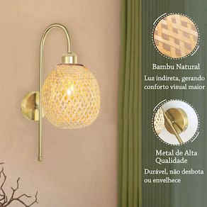 Kit 3 Arandela Dourada Interna Bambu Fibra Natural Nat92 + Led Uma elegante arandela dourada com cúpula de bambu combina sofisticação e naturalidade em um único design. A base dourada, com acabamento polido, adiciona um toque de requinte e luxo, refletindo suavemente a luz e criando um ambiente acolhedor. A cúpula, feita de tiras de bambu trançadas ou entrelaçadas, confere um aspecto artesanal e orgânico, filtrando a iluminação de forma suave e aconchegante. Esse contraste entre o brilho metálico e a textura natural do bambu torna a peça versátil, ideal para ambientes modernos, rústicos ou boho, proporcionando um charme especial a qualquer espaço.