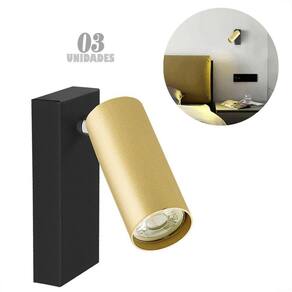 Kit 3 Arandela Spot Leitura Direcionável Dourada Quarto Lup85 A arandela estilo spot minimalista pode ser uma peça chave e prática para seu cômodo, como na cabeceira da cama, sala, escritório e entre outros ambientes. Além disso, a arandela é ajustável em ângulo, ou seja, você pode direcionar a luz exatamente para onde desejar. Ideal para um espaço de leitura ou lazer, tendo uma luz mais direcionada para onde deseja.Neste kit contém;- 03 unidades da arandela -Descrição da arandela:- Material: Alumínio- Cor:Estrutura: PretoCúpula: Dourado- Medidas:Cúpula:-- Comprimento: 9cm-- Diâmetro : 4cmEstrutura:-- Comprimento total: 5,5cm-- Altura total: 12cm-- Largura total: 13,5cm- Compatível com lâmpada: MR11;- Soquete: Gu10;- Tensão: Bivolt.Lâmpada não inclusa