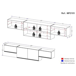 Dimensões do produto montado: Altura: 54cm | Largura: 260cm | Profundidade: 32cm *Você pode consultar as medidas detalhadas na imagem técnica do produto.