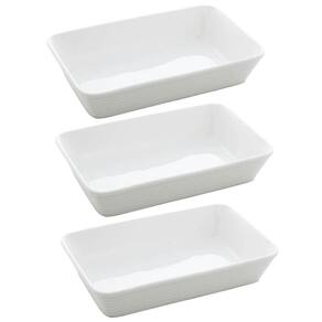 Garantia: 90 dias / Peso total: 4,746kg / Cor predominante: branco / Referência: 7794463664529; Dimensões de cada travessa: 30cm (C) x 20cm (L) x 5cm (A); Dimensões área de uso de cada travessa: 28,5cm (C) x 18,5cm (L) x 4,8cm (A); Capacidade de cada travessa: 1,5L; Conteúdo: 3 travessas de porcelana; Material: porcelana.