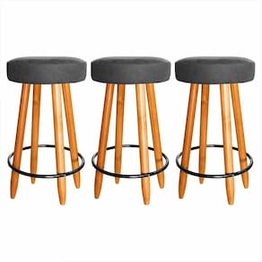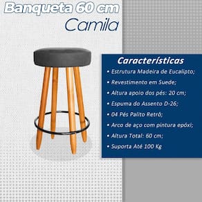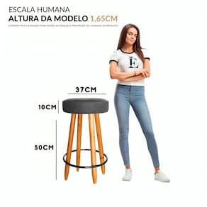 Características do Produto: - Base do assento e fundo Mdf e Mdp de 15MM; - Altura para apoio dos pés: 20 cm; - Altura do Assento: 10 cm; - Parte inferior acabamento em TNT preto; - Estrutura em madeira de eucalipto; - Arco em aço, com pintura especial epóxi; - Suporta uma pessoa até 100 kg; - Garantia 3 meses por nós fabricantes; - Formato Redondo; - Espuma do Assento D-23; - 4 Pés Palito Retrô; - 4 Chapas de Aço Galvanizado para fixação dos pés; Dimensões do produto montado: - Altura: 60 cm; - Largura: 37 cm; - Comprimento: 37 cm; Observações importantes: Para assegurar que sua banqueta mantenha sua durabilidade e beleza ao longo do tempo, siga estas recomendações: 1 - Limpeza: Use pano úmido com sabão neutro, evitando abrasivos. 2 - Proteção Solar: Evite sol direto para prevenir desgaste. 3 - Umidade: Seque imediatamente em caso de derrames. 4 - Uso Adequado: Respeite a capacidade de peso indicada e não faça movimentos perigosos em cima da banqueta. 5 - Manutenção: Inspecione periodicamente e limpe conforme instruções acima. 6 - Armazenamento: Local limpo e seco, protegido de poeira e umidade, não expor ao sol e chuva.