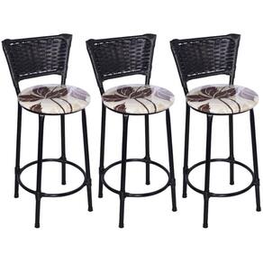 Kit 3 Banquetas Médias Preta com Encosto Junco Preto Assento Floral Marrom