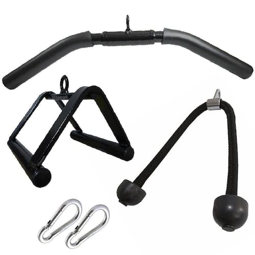 Kit 3 barras puxadores triceps pulley curvo corda triângulo ----- kit 3 puxadores academia musculação treino ------ 03 unidades : 01 puxador curvo com giro 50 cm, 01 puxador corda e 01 puxador triângulo reto maciço 02 mosquetões 6cm suporta 120 kg. Puxadores curvo 50 cm feitos em aço com pega emborrachada e soldas reforçadas, giro central e ótimo acabamento. Puxador corda tríceps feito em com corda trançada, reforçado e alta qualidade, alça de encaixe em aço cromado e apoio de mão em pvc, maciez nos exercícios evitando calos. Todos feitos em alta qualidade para serem usadas nos mais diversos aparelhos de sua academia, vai tornar seu treino mais completo, produto nacional e com garantia. Especificações técnicas puxador curvo - material: tubo oco de aço 1020- parede do aço: 2 mm - material argola: aço trefilado 1020 com 6,5 mm de espessura- material da pega: manopla emborracha de 1 1/4 (32mm)- todo soldado em mig soldas reforçadas - pintura eletrostática texturizada e anti-ferrugem - comprimento total do puxador: 50 cm - peso do produto (unidade): 1 kg- cor: preto Especificações técnicas puxador corda- material: corda trançada em polipropileno virgem - diâmetro: 25 mm de espessura - material encaixe mosquetão: aço cromado com solda reforçada - material de apoio do punho: pvc maciço - corda profissional com alma de pvc maciço - comprimento total do puxador: 75 cm (37,5 cada lado pendurado)- peso do produto (unidade): 600 gramas- cor: preto Especificações técnicas triângulo- material: aço 1020 1 polegada- parede do aço: 2 mm - material dos arcos: aço trefilado 1020 1/2 (12,7 mm) espessura - material argola: aço trefilado 1020 com 6,5 mm de espessura- todo soldado em mig soldas reforçadas - pintura eletrostática texturizada e anti-ferrugem - peso do produto (unidade): 1 kg- cor: preto Conteúdo: 01 puxador curvo com giro 50 cm, 01 puxador corda e 01 puxador triangulo reto maciço 02 mosquetões 6cm suporta 120 kg. Importante - podemos montar kits com a quantidade e itens que forem necessárias para sua academia- tire suas dúvidas conosco no campo de perguntas- nossos puxadores são profissionais, testados e aprovados, ótimo custo benefício Tire sempre suas dúvidas antes da compra Estamos a disposição AtenciosamenteEquipe famafit - tudo para seu treino