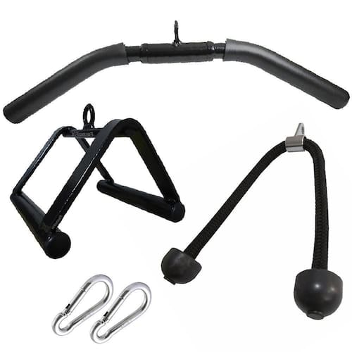 Puxadores curvo 50 cm feitos em aço com pega emborrachada e soldas reforçadas, giro central e ótimo acabamento. Puxador corda tríceps feito em com corda trançada, reforçado e alta qualidade, alça de encaixe em aço cromado e apoio de mão em pvc, maciez nos exercícios evitando calos. Todos feitos em alta qualidade para serem usadas nos mais diversos aparelhos de sua academia, vai tornar seu treino mais completo, produto nacional e com garantia.