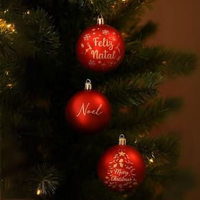 Com 8cm de diâmetro, essas bolas têm o tamanho ideal para árvores de médio a grande porte, e também podem ser usadas em guirlandas, arranjos ou em cestas decorativas. O acabamento fosco em vermelho profundo, combinado com a escrita dourada, traz um contraste refinado que valoriza qualquer ambiente.