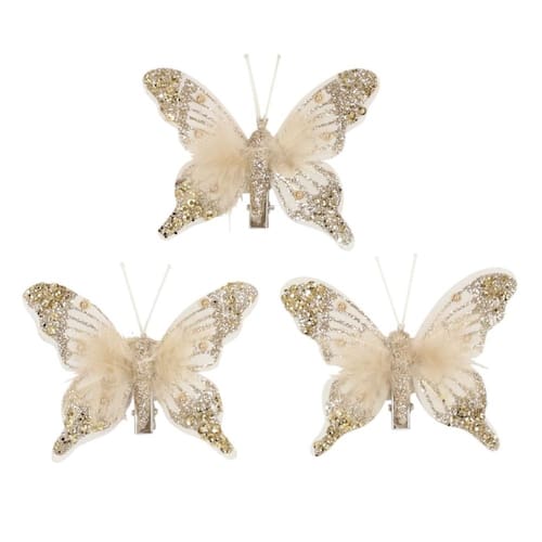 Eleve sua decoração natalina com o toque sofisticado deste kit luxuoso de 3 borboletas decoradas em tons de champanhe com plumas realísticas.