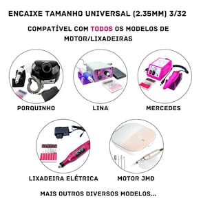As brocas possuem diâmetro de aproximadamente 2.35mm (3/32'' polegadas) que se encaixa na maioria das máquinas elétricas de manicure. - Eficiência elevada; -Não dissipa calor; -Máxima resistência ao desgaste; -Nano revestimento que garante vida longa à peça; -Lavável, desinfetável e esterilizável.