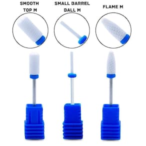 Características: -small Barrel Ball M: Broca de gramatura de corte mediano é indicada para realizar pequenos cortes e acabamentos nas proximidades das cutículas das unhas; -flame M: Broca de gramatura de corte mediano, é ideal para modelar, nivelar e esculpir as unhas artificiais; -smooth Top M: Broca de gramatura de corte mediano, é a broca perfeita para pequenos cortes e nivelamento da superfície das unhas.