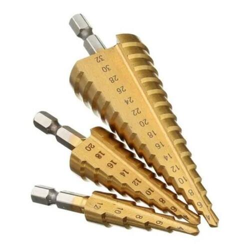 Kit 3 brocas escalonada aço profissional para 12mm/20mm/32mm Produto para e de excelente qualidade Broca escalonada Você sabe o que é broca escalonada Esta ferramenta permite furar e ampliar aos poucos o diâmetro do furo em chapas de metais. Uma das grandes vantagens desta ferramenta é permitir furar e ampliar aos poucos o diâmetro do furo em chapas de metal, sem a necessidade de trocar a broca, o que melhora a produtividade no trabalho. Além disso, uma broca escalonada de qualidade oferece um excelente acabamento à peça metálica, pois não deixa rebarbas, aquece pouco e não deforma o material. Descrição : Kit 3 brocas hss espiral / cônica/ escalonada de passo drill bit 4-12 / 4-20 / 4-32 Especificação: Marca: drillpro Modelo: db-s1 Cor: dourado como a imagem mostrada Material: aço de alta velocidade Superfície: titanium plated Scop: placa de ferro fino, alumínio, painéis de isolamento, painéis de pvc espessura de 4 mm dentro da madeira. 4 - 12 mm 9 passos 4mm, 5mm, 6mm, 7mm, 8mm, 9mm, 10mm, 11mm, 12mm , 7cm l 4 - 20 mm 9 passos 4mm, 6mm, 8mm, 10mm, 12mm, 14mm, 16mm, 18mm, 20mm , 7cm l 4 - 32 mm 15 passos 4mm, 6mm, 8mm, 10mm, 12mm, 14mm, 16mm, 18mm, 20mm, 22mm, 24mm, 26mm, 28mm, 30mm, 32mm Características : Não há necessidade de um buraco piloto Titânio revestido para reduzir a fricção e refrigerador O pedaço grande tem haste de 3 lados. Perfure automaticamente os orifícios à medida que Aço de alta velocidade, durável. Amplamente utilizado para cortar furos em uma variedade de material como aço, madeira, ferro fino, liga de alumínio, placas de isolamento, folha de pvc, ect Incluído no pacote : 1 x broca ranhurada espiral de 4-12 mm 1 x 4-20mm broca ranhurada espiral 1 x broca ranhurada em espiral de 4-32 mm