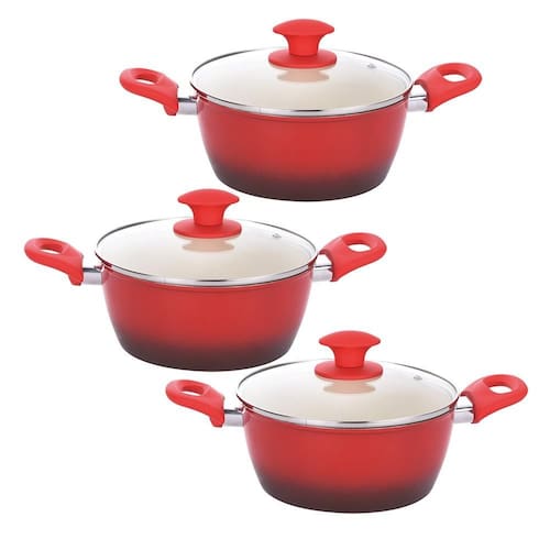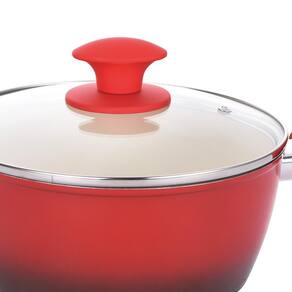 - Altura: 11cm - Altura com Tampa: 18cm - Diâmetro: 24cm - Capacidade: 4,45l - Espessura: 3,7 mm - Material: Alumínio com revestimento cerâmico - Marca: Class Home - Cor: Vermelho - Referência: 2081 - Conteúdo: 3 Caçarolas