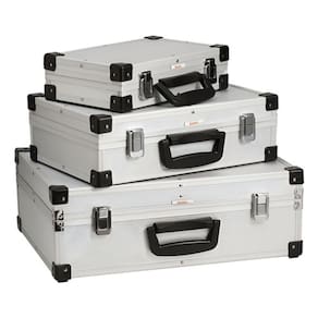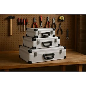 Organize suas ferramentas com o Kit de 3 Caixas Organizadoras em Aluminio. Esse conjunto robusto e duravel e ideal para quem precisa manter suas ferramentas em ordem e facilmente acessiveis. As caixas sao feitas de aluminio resistente, garantindo longa duracao e capacidade de resistir a ambientes de trabalho desafiadores. O kit inclui tres caixas de diferentes tamanhos (grande, media e pequena) para atender a todas as suas necessidades de armazenamento.
