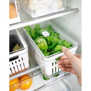 Kit 3 caixas organizadora geladeira frutas verduras legumes Descrição Organizador para geladeira clear fresh com cesto legumes frutas e verduras Mantem o frescor dos seus alimentos por mais tempo, e geladeira super organizada e linda Com o organizador de geladeira clear fresh com cesto , você terá organização e irá conservar e manter o frescor de seus alimentos por mais tempo, a tampa com ventilação ajustável mantém o nível de umidade ideal para cada tipo de alimento, mantendo-os frescos por mais tempo. Possui um cesto de drenagem que impede que a umidade acumulada se mantenha no alimento, evitando o murchamento e deterioração precoce. Caracteristicas: - material bandeja - polipropileno; - material organizador - polientireno; - cor: transparente; - cesto para drenar agua dos alimentos; - medidas axlxc: 13 x 15 x 30cm; - peso: 600g; Vantagens: - ventilação e humidade controlada; - organização e otimização de espaço; - com cesto de drenagem removível; - capacidade 5l. Acompanha: 01 organizador clear fresh com cesto medidas axlxc: 13 x 15 x 30cm; 5 litros 01 organizador clear fresh medidas axlxc: 13 x 15 x 30cm; - 5 litros 01 organizador clear fresh medidas axlxc: 7x 15 x 30cm; - 2,8 litros