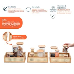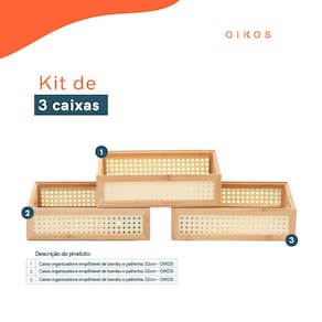 "Conheça o Kit de 3 caixas organizadoras empilháveis de bambu e palhinha 32cm da OIKOS.Multiuso, versáteis, duráveis e higiênicas, são ótimas para guardar e organizar acessórios, brinquedos, perfumes, potes e o que precisar! Caem bem em diversos ambientes e são empilháveis, ajudando a otimizar espaços.São de bambu, MDF, plástico e acrílico. Para limpar, basta utilizar um pano úmido e deixar secar em local arejado.Leve qualidade e modernidade para sua casa!O kit contém:3 caixas organizadoras empilháveis de bambu e palhinha 32cm"