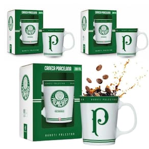 Kit 3 canecas porcelana xícara branca verde premium 260ml café palmeiras oficial selo Kit 3 unidades caneca porcelana premium 260ml café palmeiras oficial com selo licenciado A caneca caneca porcelana premium do verdão é perfeita para os palmeirense mais apaixonados demonstrarem todo o carinho pelo seu time e ao mesmo tempo apreciar suas bebidas favoritas nos momentos mais aconchegantes da vida. Além disso você pode usá-la como porta treco, porta lápis ou presentear alguém especial. ela é fabricada em porcelana de alta qualidade que garante maior durabilidade durante seu uso e possui estampas únicas com cores vivas para deixar o ambiente ainda mais divertido e estiloso.