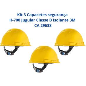Kit 03 Capacetes de Segurança 3M CA 29638 Proteção e Conforto para Ambientes de Trabalho Exigentes O Capacete de Segurança 3M™ H-700 foi desenvolvido para proteger a cabeça do usuário contra impactos de pequenos objetos e perfurações. Fabricado em polietileno de alta densidade, oferece alta resistência em ambientes de trabalho exigentes. A suspensão se conforma à base do crânio, evitando pontos de tensão e proporcionando maior estabilidade e conforto.