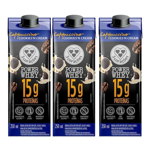 Kit 3 Bebida Láctea Power Whey Cappuccino Cookiesn Cream 250ml - 3 Corações