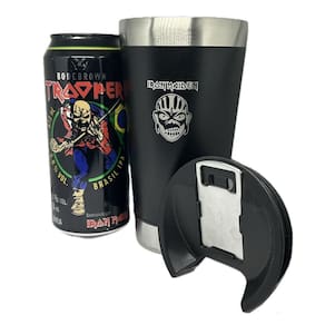 - 3 Cervejas Trooper Lata 473ml - 1 Copo Térmico 500ml com tampa e abridor
