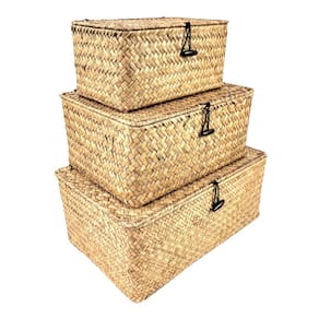 Confeccionadas em fibra natural trançada, estas caixas trazem a beleza orgânica e a textura acolhedora que complementam diversos estilos de decoração, do boho ao minimalista. O kit é composto por três tamanhos: a caixa p, com aproximadamente 11,5 cm de altura, 24 cm de largura e 14 cm de profundidade, pesando 210g; a caixa m, com cerca de 13,5 cm de altura, 29,5 cm de largura e 21 cm de profundidade, pesando 360g; e a caixa g, medindo aproximadamente 15 cm de altura, 36,5 cm de largura e 23,5 cm de profundidade, com 430g. Juntas, elas oferecem um espaço prático pra guardar uma variedade de objetos, desde acessórios e produtos de higiene a livros e correspondências, mantendo tudo arrumado e acessível. A diferença de tamanhos permite encaixá-las em diferentes espaços ou utilizá-las em conjunto para uma composição organizada e visualmente agradável.