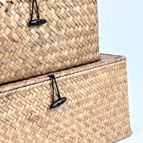 Confeccionadas em fibra natural trançada, estas caixas trazem a beleza orgânica e a textura acolhedora que complementam diversos estilos de decoração, do boho ao minimalista. O kit é composto por três tamanhos: a caixa p, com aproximadamente 11,5 cm de altura, 24 cm de largura e 14 cm de profundidade, pesando 210g; a caixa m, com cerca de 13,5 cm de altura, 29,5 cm de largura e 21 cm de profundidade, pesando 360g; e a caixa g, medindo aproximadamente 15 cm de altura, 36,5 cm de largura e 23,5 cm de profundidade, com 430g. Juntas, elas oferecem um espaço prático pra guardar uma variedade de objetos, desde acessórios e produtos de higiene a livros e correspondências, mantendo tudo arrumado e acessível. A diferença de tamanhos permite encaixá-las em diferentes espaços ou utilizá-las em conjunto para uma composição organizada e visualmente agradável.