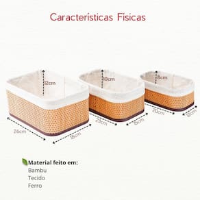 Distribuído por feheros shop Kit 3 cestos organizadores de bambu premium multiuso com forro Atenção Os cestos de bambu são ideais para quem procura unir organização e sustentabilidade no dia a dia. Fabricados com bambu natural, um material leve, resistente e moldável, são uma escolha prática e elegante para diversos usos. Por serem feitos com matéria-prima ecológica e sustentável, esses cestos ajudam a reduzir o impacto ambiental, oferecendo uma solução funcional e moderna para organizar seus ambientes. - produto premium feito com bambu natural de alta qualidade. - materiais ecológicos e sustentáveis, aliando beleza e resistência. - leia atentamente a descrição para garantir o melhor uso dos cestos. Informações do produto: O kit 3 cestos organizadores de bambu premium multiuso com forro é a escolha perfeita para quem deseja manter os ambientes organizados com charme e praticidade. Fabricados em bambu natural, eles possuem forro interno que protege os objetos armazenados e adiciona um toque de sofisticação. Podem ser em diferentes cômodos da casa ou até no escritório, sendo ideais para guardar pequenos itens, acessórios, produtos de higiene, entre outros. Combinando design atemporal e funcionalidade, esses cestos são perfeitos para compor ambientes modernos e sustentáveis. Especificações técnicas: - kit com 3 tamanhos diferentes para atender às suas necessidades de organização. - feitos de bambu natural, material leve, resistente e moldável. - composição: bambu, ferro e tecido. - forro interno removível e lavável para maior praticidade no dia a dia. - estrutura reforçada com alta durabilidade. - matéria-prima ecológica e sustentável, respeitando o meio ambiente. Ficha técnica do produto: - cesto p: altura 8cm x largura 12cm x comprimento 20cm - cesto m: altura 10cm x largura 15cm x comprimento 23cm - cesto g: altura 12cm x largura 18cm x comprimento 26cm - material principal: bambu natural - composição: bambu, ferro, tecido - forro: sim, removível e lavável Itens inclusos no pacote: 01 cesto p em bambu natural para organização 20cm x 12cm x 8cm 01 cesto m em bambu natural para organização 23cm x 15cm x 10cm 01 cesto g em bambu natural para organização 26cm x 18cm x 12cm Todas as fotos são reais do produto. Qualquer dúvida, estamos à disposição Marca: Não Informado
