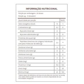 Ingredientes: Peptídeos bioativos de colágeno hidrolisado com peso molecular médio de 2kDa, romã em pó, ácido ascórbico vitamina C , bisglicinato de zinco zinco , D-biotina, aromatizante idêntico ao natural, antiumectante dióxido de silício, acidulante ácido cítrico, corante vermelho beterraba e edulcorante glicosídeos de steviol.