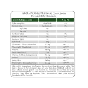 Ingredientes: Óleo de soja, água purificada, nicotinamida, d-pantotenato de cálcio, riboflavina, cloridrato de piridoxina, nitrato de tiamina, ácido fólico, d-biotina e cianocobalamina. Gelificante gelatina (INS 428), umectante glicerina (INS 422), emulsificante lecitina de soja (INS 322), glaceante cera de abelha (INS 901) e corantes: dióxido de titânio (INS 171), amarelo de quinoleína (INS 104), azul brilhante FCF (INS 133) e amarelo crepúsculo (INS 110). ALÉRGICOS: CONTÉM DERIVADOS DE SOJA.