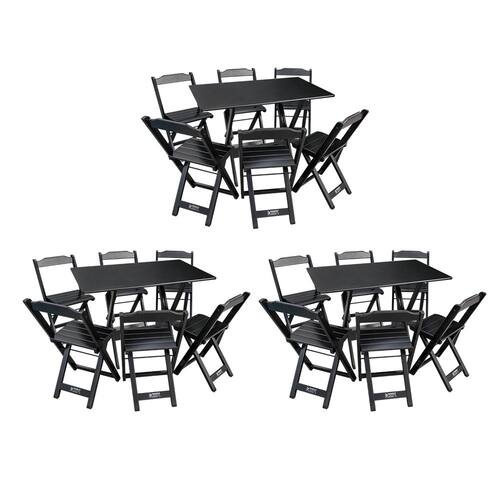 Kit 3 Conjuntos De Mesa Dobráveis De Madeira 70x110cm Com 6 Cadeiras Preta O Conjunto Dobrável é ideal para bares, restaurantes, estabelecimentos, áreas de lazer e também para sua casa. Em madeira tornando-os resistentes e duráveis, seu design permite que esse conjunto seja encaixado em qualquer ambiente, trazendo um toque a mais para seu estabelecimento. Além de sua durabilidade, o que lhe trará conforto para servir seus clientes. Por ser dobrável torna-se mais fácil guardar, manusear e limpar o produto.