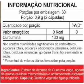Extrato de rizomas de cúrcuma longa, agente de massa celulose microcristalina e antiumectante estearato de magnésio. Cápsula: Gelatina vegetal e água purificada.